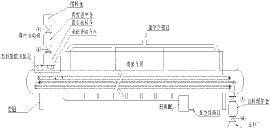 為物料的連續進出,采用雙級真空擋板閥裝置。該裝置由進料斗、緩沖倉、上真空擋板閥、暫存倉、下真空擋板閥、接口等部分組成。同時,在進料端輔以電磁布料裝置,使物料均勻分布于傳送帶上。其動作過程為,初始狀態上、下真空擋板閥均閉合,物料經進料斗進入緩沖倉,達到一定質量后,上真空擋板閥首先打開,物料進入緩沖倉,然后上真空擋板閥關閉,下真空擋板閥打開,物料經接口進入設備內部,下真空擋板閥關閉,完成一動作循環,準備進入下一循環。輔助的布料裝置,了間隙時間內,物料的連續性。真空擋板閥采用電動控制,同時擋板上嵌有食品級硅橡膠密封材料用以真空密封,接口處有導電材料密封微波。