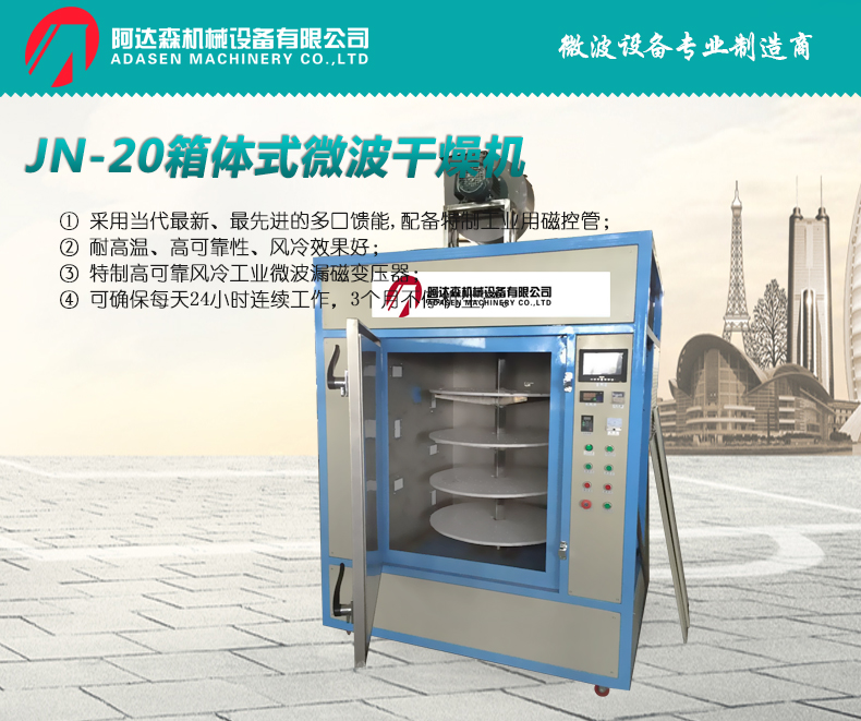 JN-20箱體式微波干燥機是一種常用的食品微波干燥設備,適用于各種食品的干燥和殺菌。下面是JN-20箱體式微波干燥機的介紹: